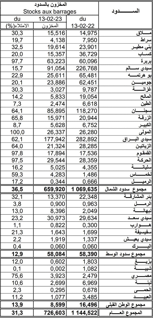 أعلن المهندس بالمعهد الوطني للرصد الجوي ،محرز الغنوشي، أن نسبة إمتلاء السدود الجملية اليوم الاثنين 13 فيفري، بلغت 31.3 بالمائة، وفق آخر تحيين لوزارة الفلاحة.