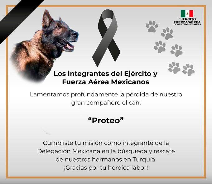 ووفقاً لتقارير مكسيكية، فإن وزير الدفاع المكسيكي قررت إقامة الجنازة العسكرية تخليداً للكلب '' بروتيو'' الذى يعد من فصيلة جيرمن شيبرد الألمانية والذى يعد أحد أفضل الكلاب المكسيكية التي تحظي بتدريب خاص على أعمال الإنقاذ، وتوفي منذ أيام في مدينة أدي يامان التركية بعد مساعدته في إنقاذ شخصين من تحت الأنقاض.