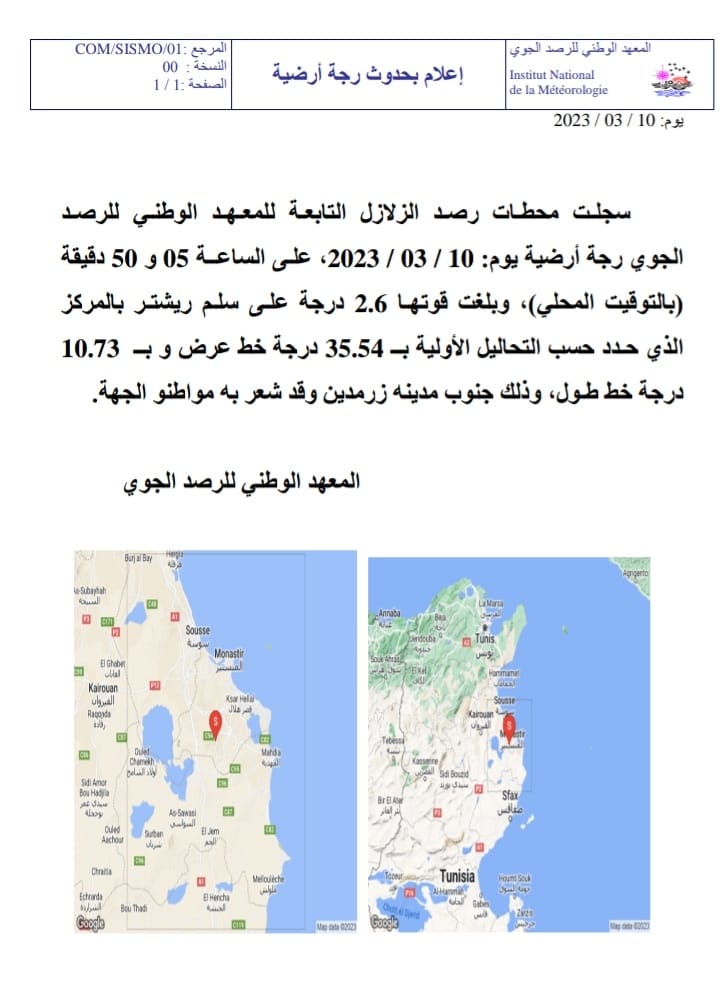 سجلت محطات رصد الزلازل التابعة للمعهد الوطني للرصد الجوي رجة أرضية ، صباح اليوم الجمعة 10 مارس 2023، على الساعة 5 و50 دق بلغت قوتها 2.6 على سلم ريشتر بالمركز الذي حدد حسب التحاليل الأولية بجنوب مدينة زرمدين من ولاية المنستير وقد شعر بها الاهالي.