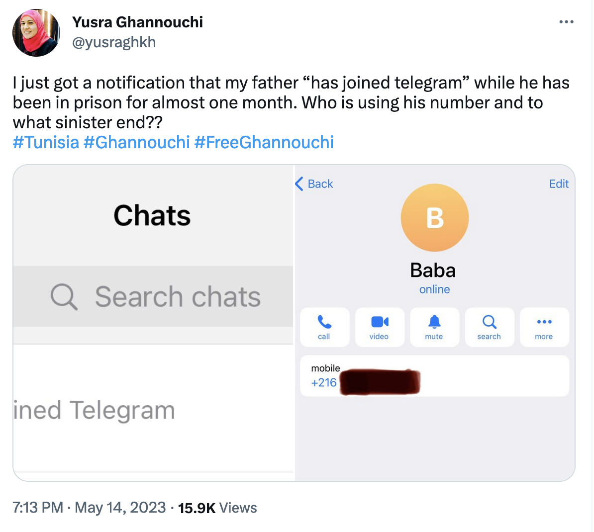 أعلنت حركة النهضة، الأحد 14 ماي 2023، إنه قد تم مساء الأحد تشغيل شريحتي هاتف رئيس الحركة راشد الغنوشي من طرف جهة غير معلومة.