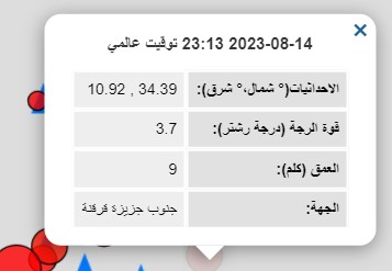 أفاد المعهد الوطني للرصد الجوي، الثلاثاء 15 أوت 2023، بأنّ محطات سجلت على منتصف الليل و13 دقيقة حسب التوقيت المحلي، رجة أرضية بلغت قوتها 3.7 درجات على سلم ريختر.