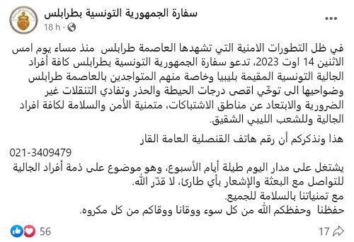 وكانت سفارة الجمهورية التونسية بطرابلس قد دعت كافة أفراد الجالية التونسية المقيمة بليبيا وخاصة منهم المتواجدين بالعاصمة طرابلس وضواحيها، إلى توخّي أقصى درجات الحيطة والحذر وتفادي التنقلات غير الضرورية والابتعاد عن مناطق الاشتباكات، "في ظل التطورات الأمنية التي تشهدها العاصمة طرابلس منذ مساء الاثنين 14 أوت 2023".