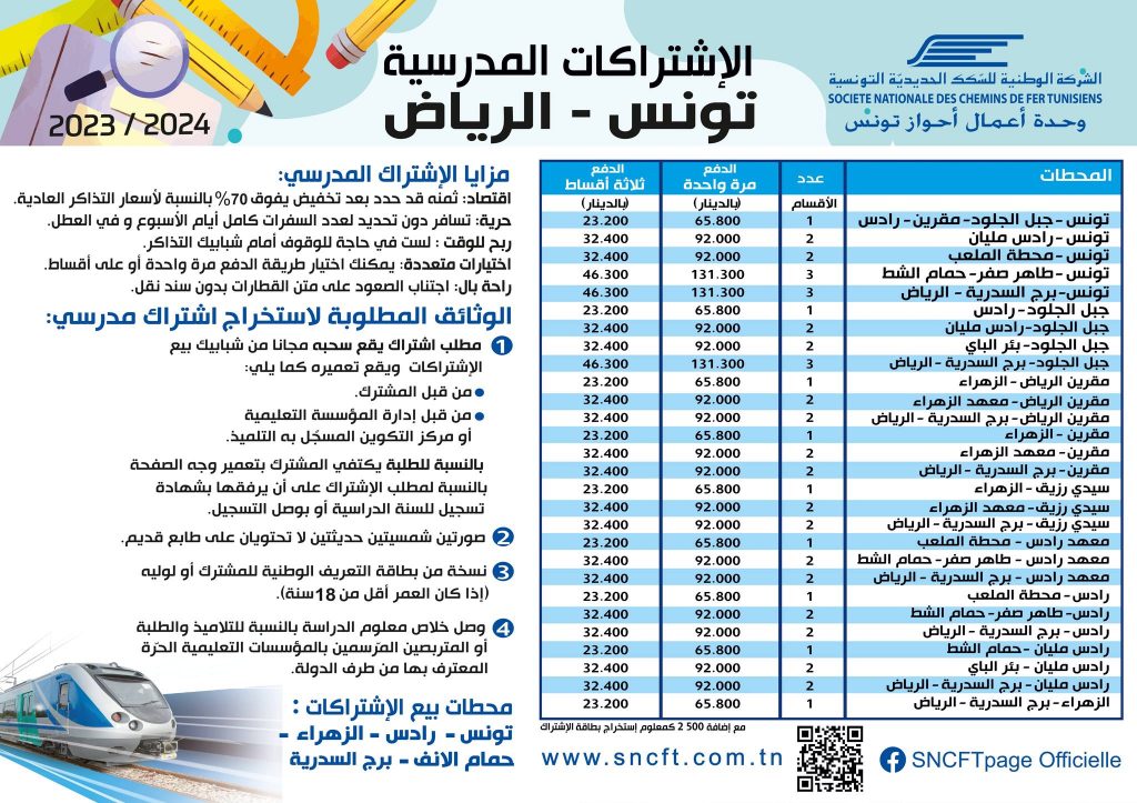 شرعت الشَركة الوطنيَة للسّكك الحديديَة التّونسيَة، في بيع الاشتراكات المدرسيَة والجامعية للموسم الدراسي 2023-2024 الخاصة بقطارات مسافري خطّي أحواز تونس، تونس- الرياض وتونس-بوقطفة، وأحواز السّاحل وذلك بمختلف نقاط البيع بمحطَات هذه الخطوط.