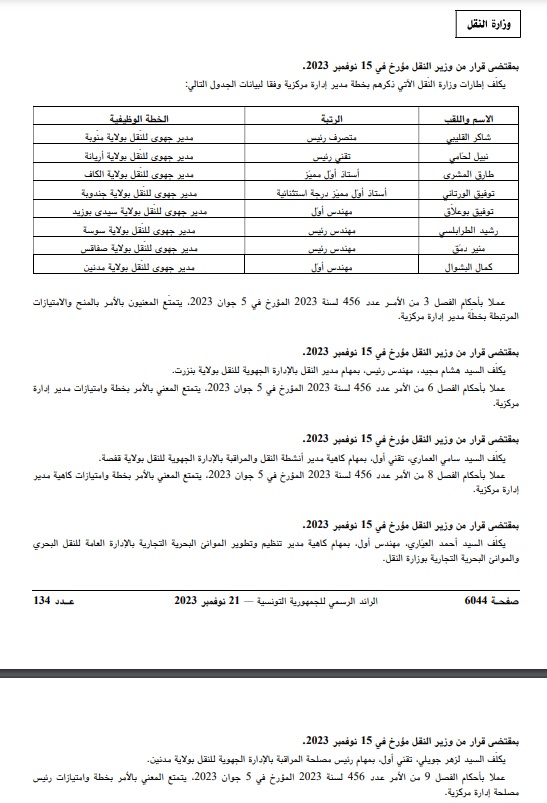 صدرت بالعدد الأخير من الرائد الرسمي للجمهورية التونسية، بتاريخ يوم أمس الثلاثاء 21 نوفمبر 2023، جملة من التعيينات الجديدة صلب وزارة النقل.