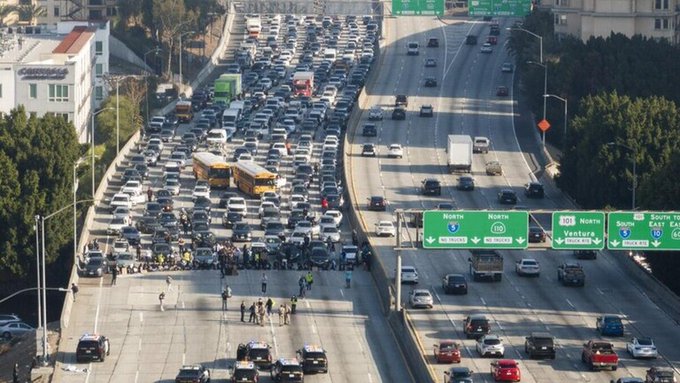 وجلس محتجون من منظمة ''إف نوت ناو'' (إن لم يكن الآن) في الحارات المرورية المتجهة جنوبا بالطريق السريع 110 بوسط المدينة عند حوالي الساعة التاسعة صباحا، ما أدى إلى توقف الحركة.