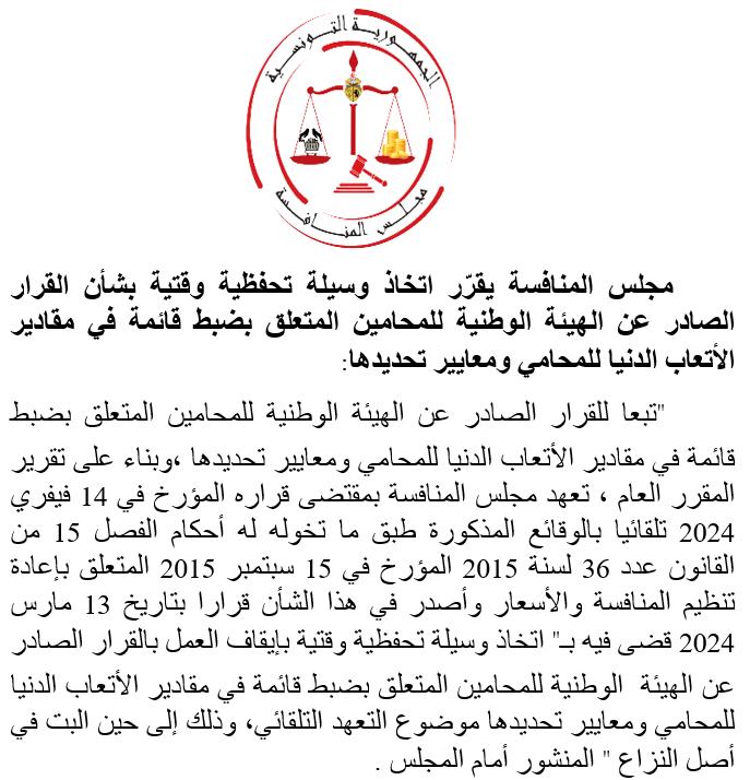 وأصدر مجلس المنافسة قرارًا قضى فيه بـ"اتخاذ وسيلة تحفظية وقتية بإيقاف العمل بالقرار الصادر عن الهيئة الوطنية للمحامين المتعلق بضبط قائمة في مقادير الأتعاب الدنيا للمحامي ومعايير تحديدها موضوع التعهد التلقائي، وذلك إلى حين البت في أصل النزاع" المنشور أمام المجلس، حسب تعبيره .