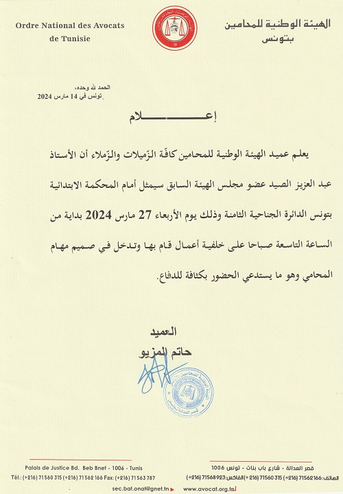 وأوضح عميد المحامين التونسيين في بيان أصدره بتاريخ 21 مارس 2024، أن إحالة المحامي عبد العزيز الصيد على أنظار المحكمة تأتي "على خلفية أعمال قام بها وتدخُل في صميم مهام المحامي"، حسب نص البيان.