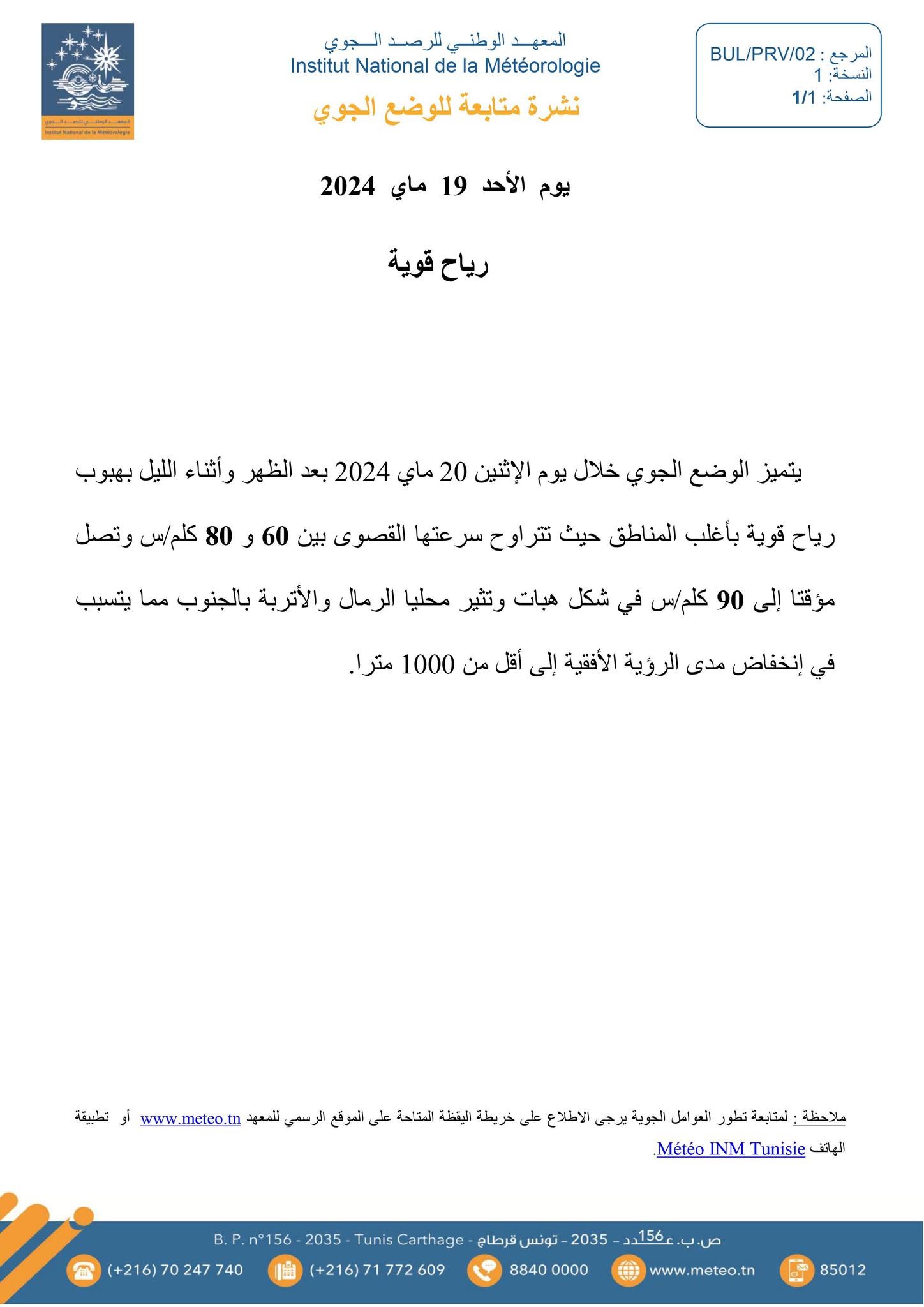 أصدر المعهد الوطني للرصد الجوي ، اليوم الأحد 19 ماي 2024، بيانًا حذّر فيه من رياح قوية بأغلب المناطق خلال يوم الاثنين 20 من الشهر الجاري.