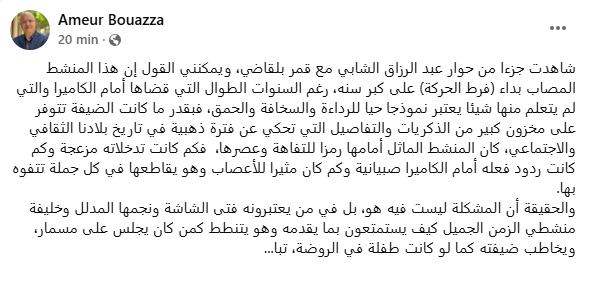 وأضاف أن الضيفة، قمر بلقاضي، ''كانت تحمل ذاكرة غنية بالذكريات والتفاصيل عن فترة ذهبية من تاريخ تونس الثقافي والاجتماعي، لكن في المقابل كان المنشط الذي يحاورها رمزًا للتفاهة وعصرها''.