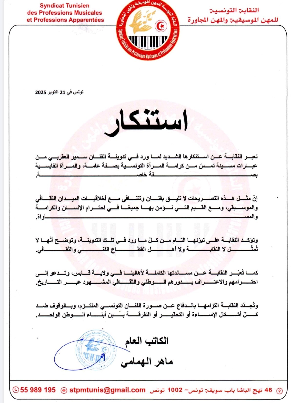 وفي سياق متصل، أصدرت النقابة التونسية للمهن الموسيقية والمهن المجاورة بيانًا شديد اللهجة، عبّرت فيه عن رفضها التام لما تضمّنته التدوينة من عبارات تمسّ من كرامة المرأة التونسية، وخاصة نساء قابس.