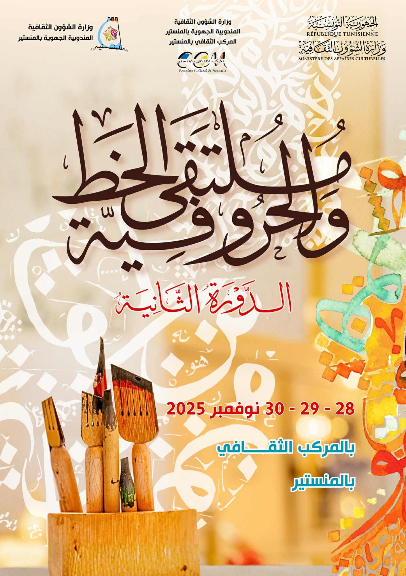 ينظم المركب الثقافي بالمنستير الدورة الثانية من ملتقى الخط والحروفية خلال أيام 28 و29 و30 نوفمبر 2025.