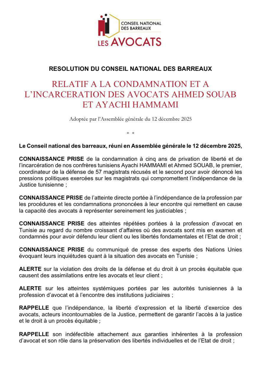 وجدد مجلس هيئة المحامين بفرنسا تضامنه الكامل مع المحاميين العياشي الهمامي وأحمد صواب، ومع جميع القضاة والعاملين في قطاع العدالة بتونس، مطالبًا السلطات التونسية والفرنسية والمجتمع الدولي بالقيام بكل الوسائل المتاحة لوقف الانتهاكات المتكررة، وداعيًا إلى الإفراج الفوري عن العياشي الهمامي وأحمد صواب.