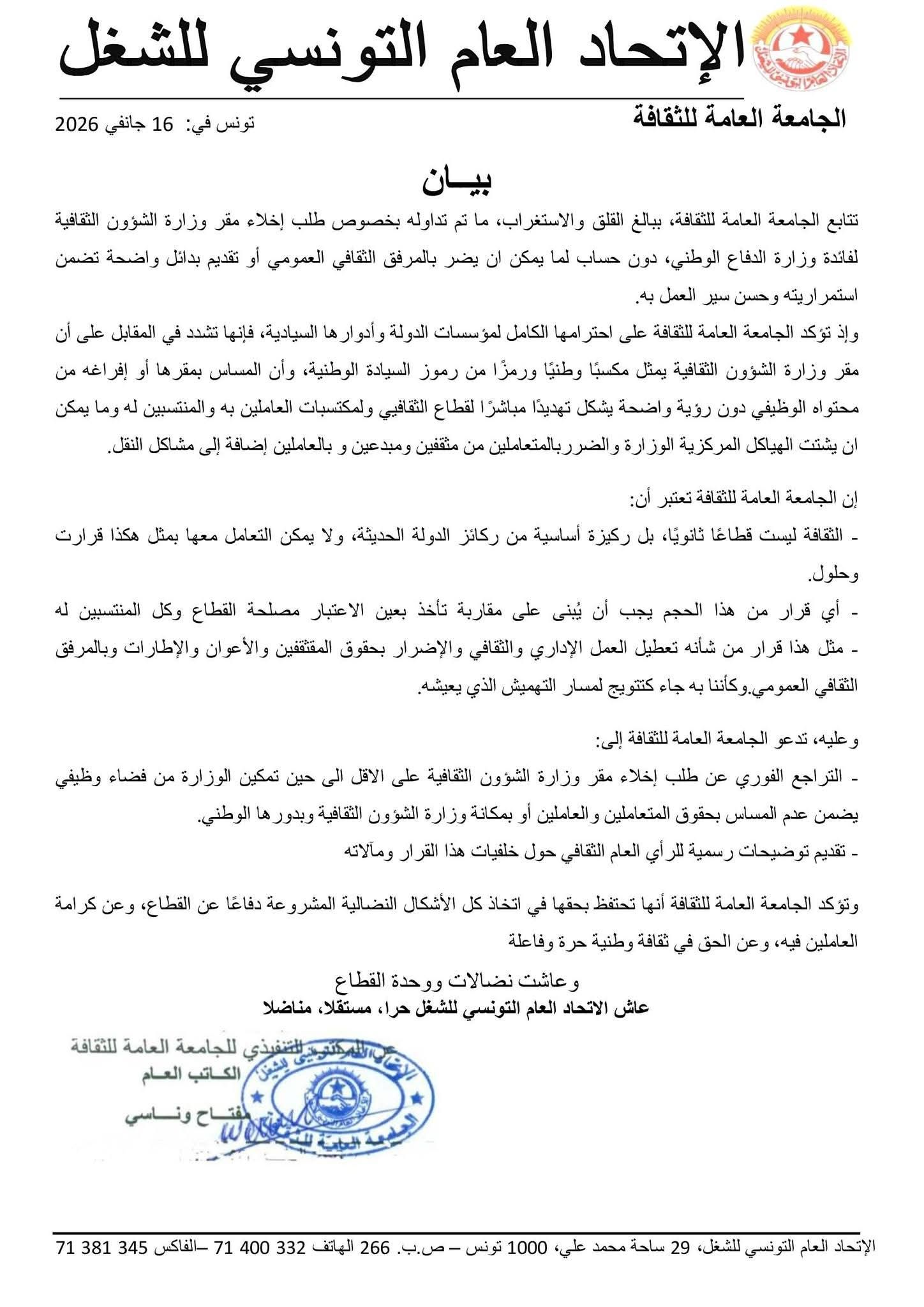 وجدّدت الجامعة تأكيدها على أنّ "الثقافة ليست قطاعًا ثانويًا، بل ركيزة من ركائز الدولة الحديثة»، مبرزة أنّ مقر وزارة الشؤون الثقافية يُعد مكسبًا وطنيًا ورمزًا من رموز السيادة، وأن المساس به أو إفراغه من محتواه الوظيفي دون تصوّر واضح يمثّل تهديدًا مباشرًا للقطاع، وقد يُفضي إلى تشتيت الهياكل المركزية وإرباك مصالح المتعاملين والعاملين، إلى جانب ما يطرحه من صعوبات لوجستية، مع التشديد في المقابل على احترامها لمؤسسات الدولة وأدوارها السيادية.