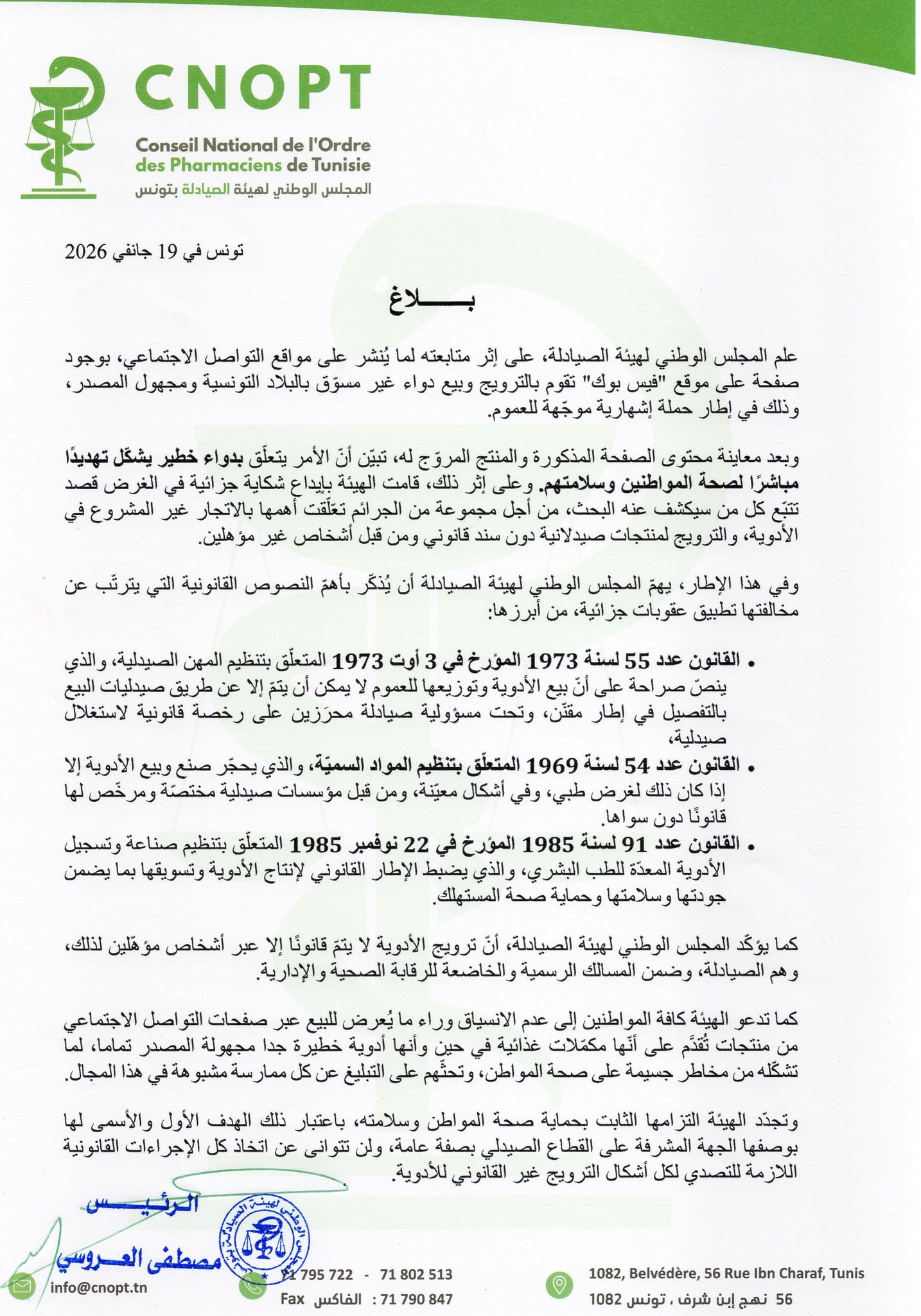 أعلنت الهيئة الوطنية للصيادلة اتخاذها قرار مقاضاة صفحة على موقع فيسبوك تعمد إلى الترويج لدواء غير متداول في السوق التونسية ومجهول المصدر، في خطوة اعتبرتها تهديدًا مباشرًا للصحة العامة.