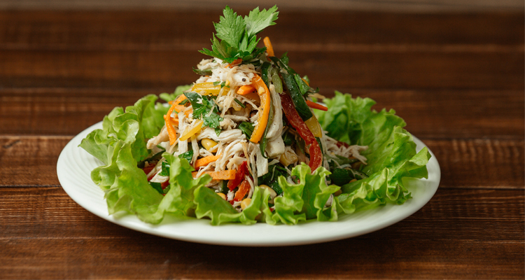 - في طبق التقديم يفرش الخس الأخضر والفريزي و تضاف إليه اللوبيا والخيار والطماطم والبصل والفرماج والخبز المحمص ويسقى بالصلصة ويزين بالتونة والزيتون والبيض المسلوق مقطع إلى دوائر.
