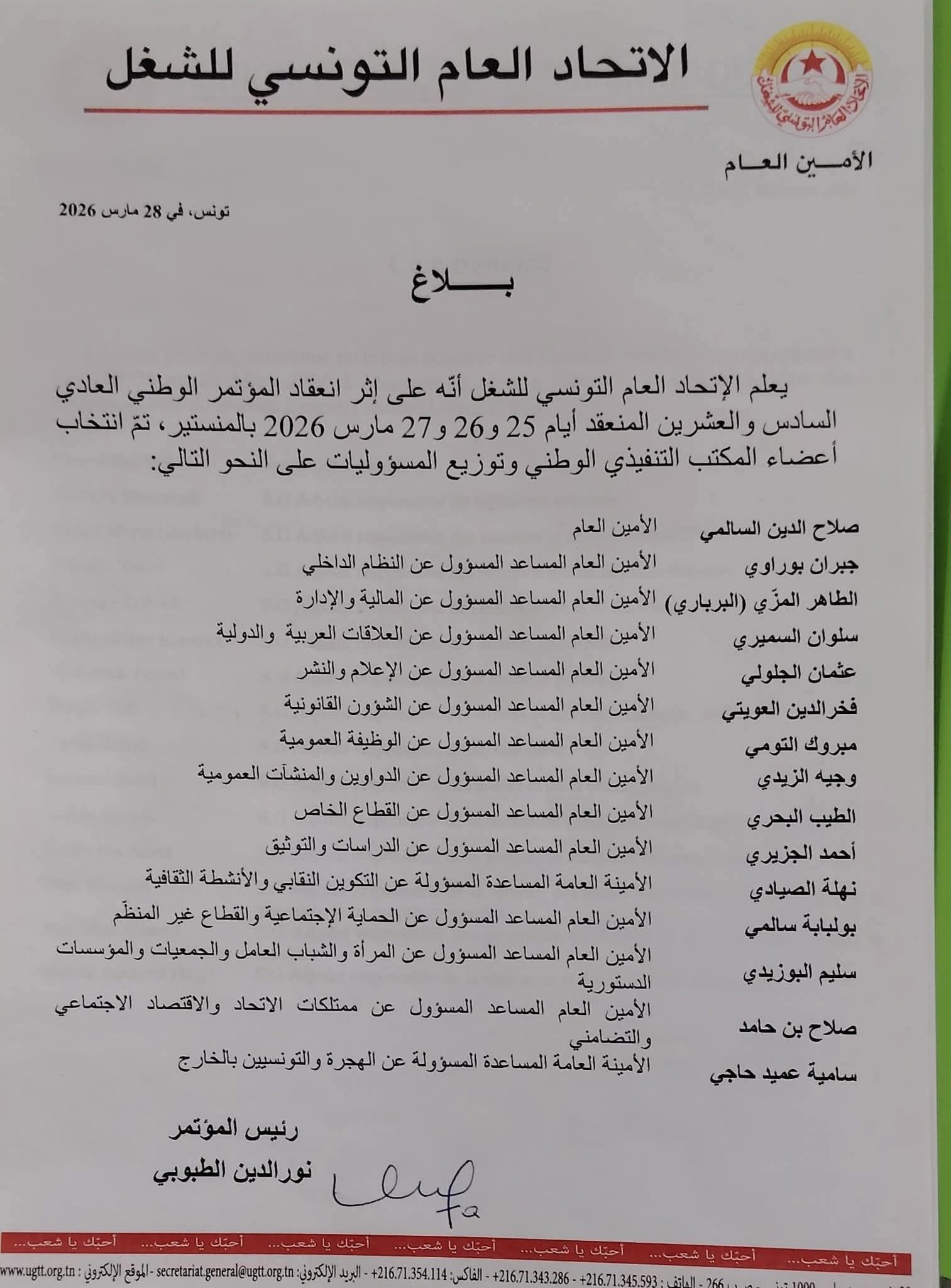 أفرز المؤتمر الأخير للاتحاد العام التونسي للشغل المنعقد في المنستير، تركيبة القيادة الجديدة للمنظمة النقابية بزعامة الأمين العام الجديد صلاح الدين السالمي خلفًا لنور الدين الطبوبي، بعد فوز قائمته "الثبات والتحدي" التي حصدت أغلب الأصوات.