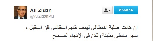 وأضاف زيدان عبر بضعة تغريدات دونها على موقع التواصل الاجتماعي تويتر أنه لن يقدم استقالته إذا كان المقصد من اختطافه هو إجباره على الاستقالة.
