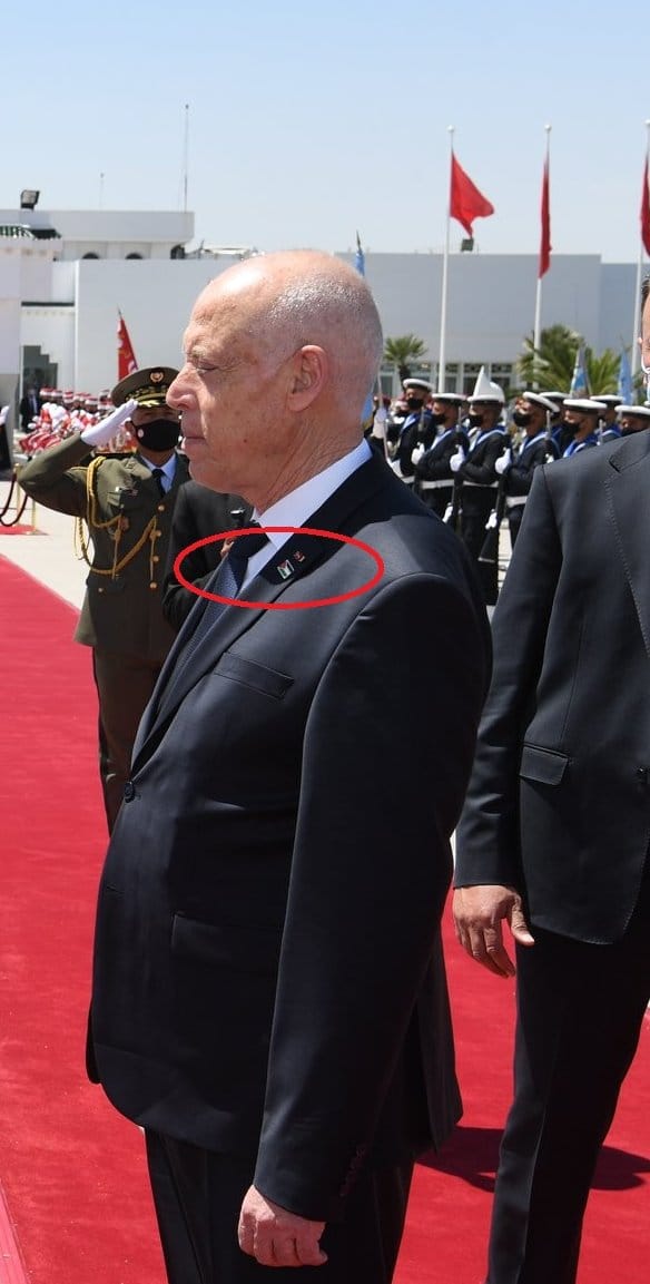 وضع رئيس الجمهورية قيس سعيد اليوم الاثنين 17 ماي 2021 علم فلسطين على بدلته كحركة تضامنية مناصرة للقضية أثناء مغادرته إلى فرنسا لملاقاة نظيره إيمانوييل ماكرون.