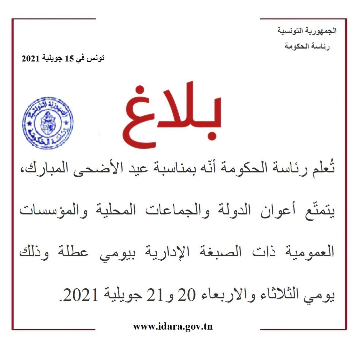 أعلنت وزارة الوظيفية العمومية في بلاغ اليوم الخميس 15 جويلية 2021 أنّه بمناسبة عيد الأضحى المبارك، سيتمتع أعوان الدولة والجماعات المحلية والمؤسسات العمومية ذات الصبغة الإدارية بيومي عطلة الثلاثاء والاربعاء 20 و21 جويلية 2021.