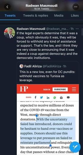 وكتب المصمودي في سلسلة من التغريدات على حسابه الرسمي بموقع التويتر يقول فيها ان ما حدث في تونس هو اعتداء صارخ على الديمقراطية، مضيفا انه في حالة الانقلاب ستضطر الولايات المتحدة إلى قطع المساعدات الانسانية والتلاقيح عن تونس كوسيلة ضغط على رئيس الجمهورية قيس سعيّد.