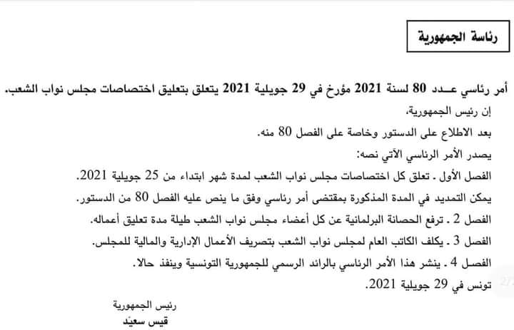 ويشتمل هذا الأمر على 4 فصول جاء في أولها ما يلي: "تعلق كل اختصاصات مجلس نواب الشعب لمدة شهر ابتداء من 25 جويلية 2021، مع إمكانية التمديد في المدة المذكورة بمقتضى أمر رئاسي، وفق ما ينص عليه الفصل 80 من الدستور".