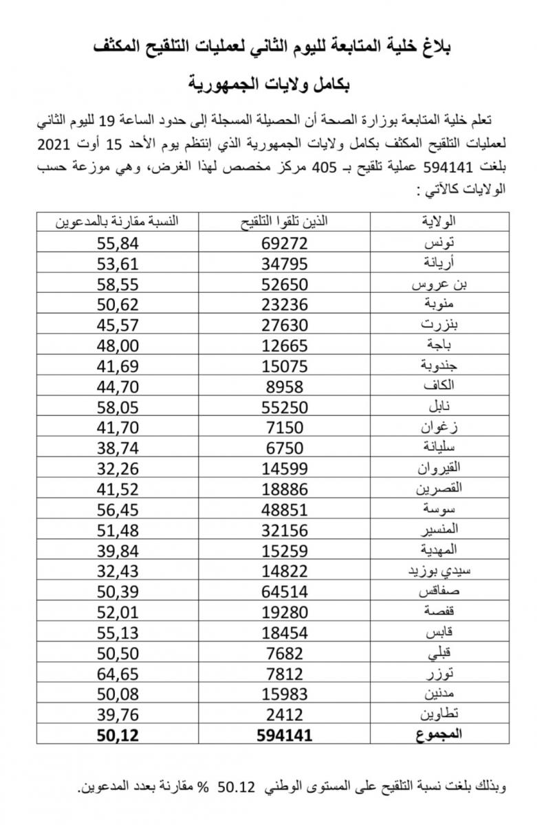 و أعلنت خلية المتابعة بوزارة الصحة، أن الحصيلة المسجلة لعمليات التلقيح المكثف بكامل ولايات الجمهورية الذي إنتظم يوم الأحد 15 أوت 2021 بلغت، 594141 عملية تلقيح بـ 405 مركز مخصص لهذا الغرض.وحسب خلية المتابعة بوزارة الصحة، تتوزع التلاقيح حسب الولايات كالآتي :