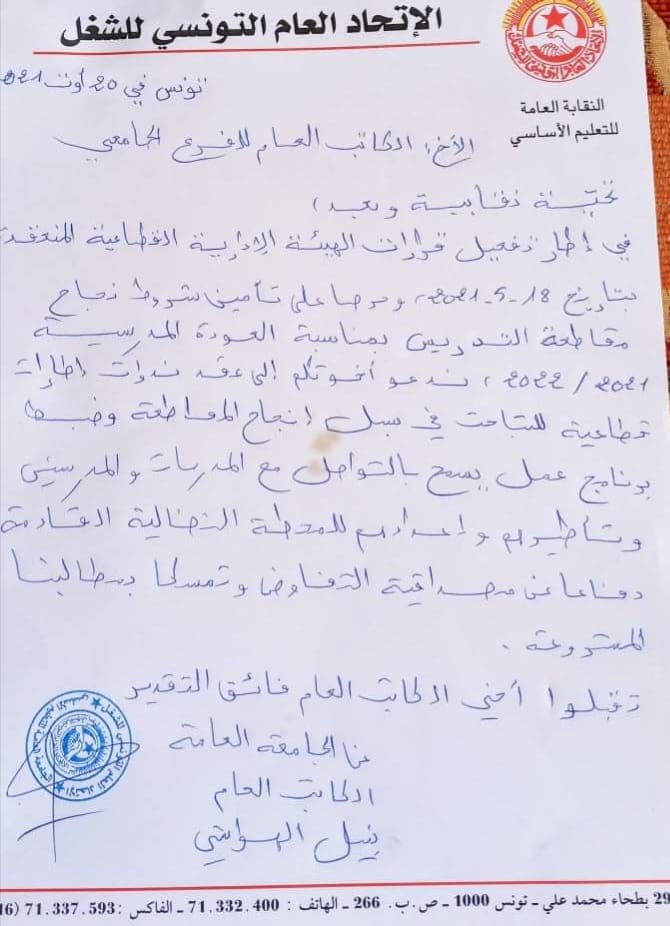 دعا الكاتب العام للجامعة التعليم الاساسي نبيل الهواشي، يوم امس الأربعاء 25 أوت 2021، الفروع الجامعية الجهوية للنقابة إلى الاستعداد لمقاطعة العودة المدرسية القادمة