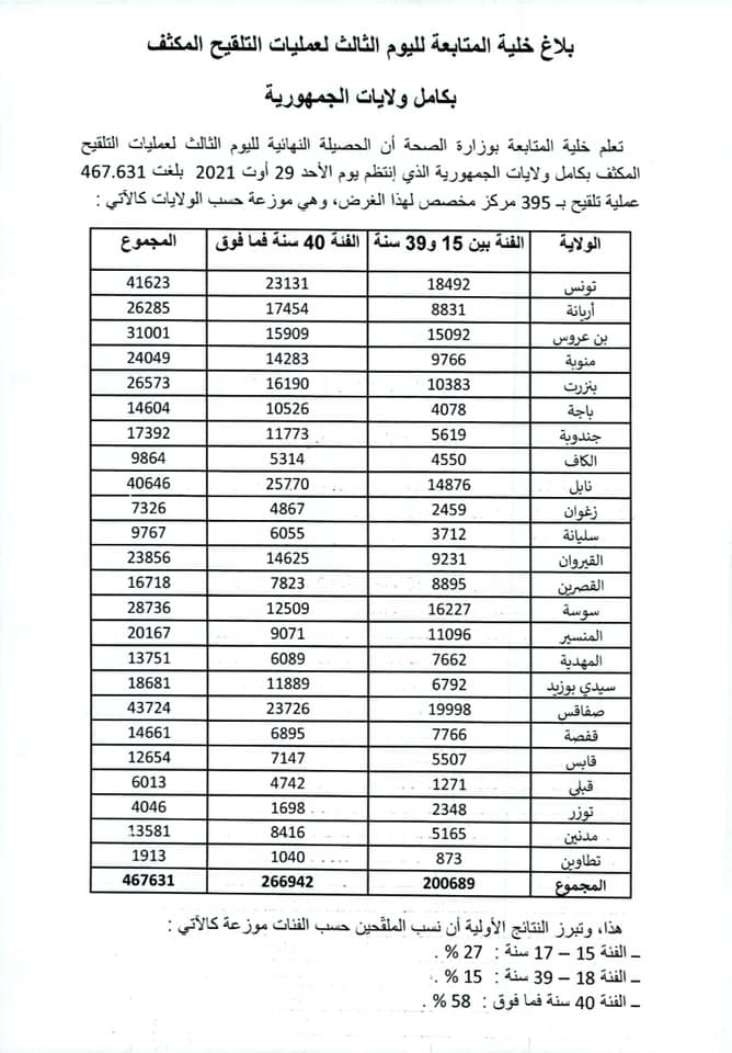 وتمت عمليات التلقيح خلال اليوم الثالث من أيام التلقيح المكثف ب 395 مركز موزعة على كامل تراب الجمهورية.