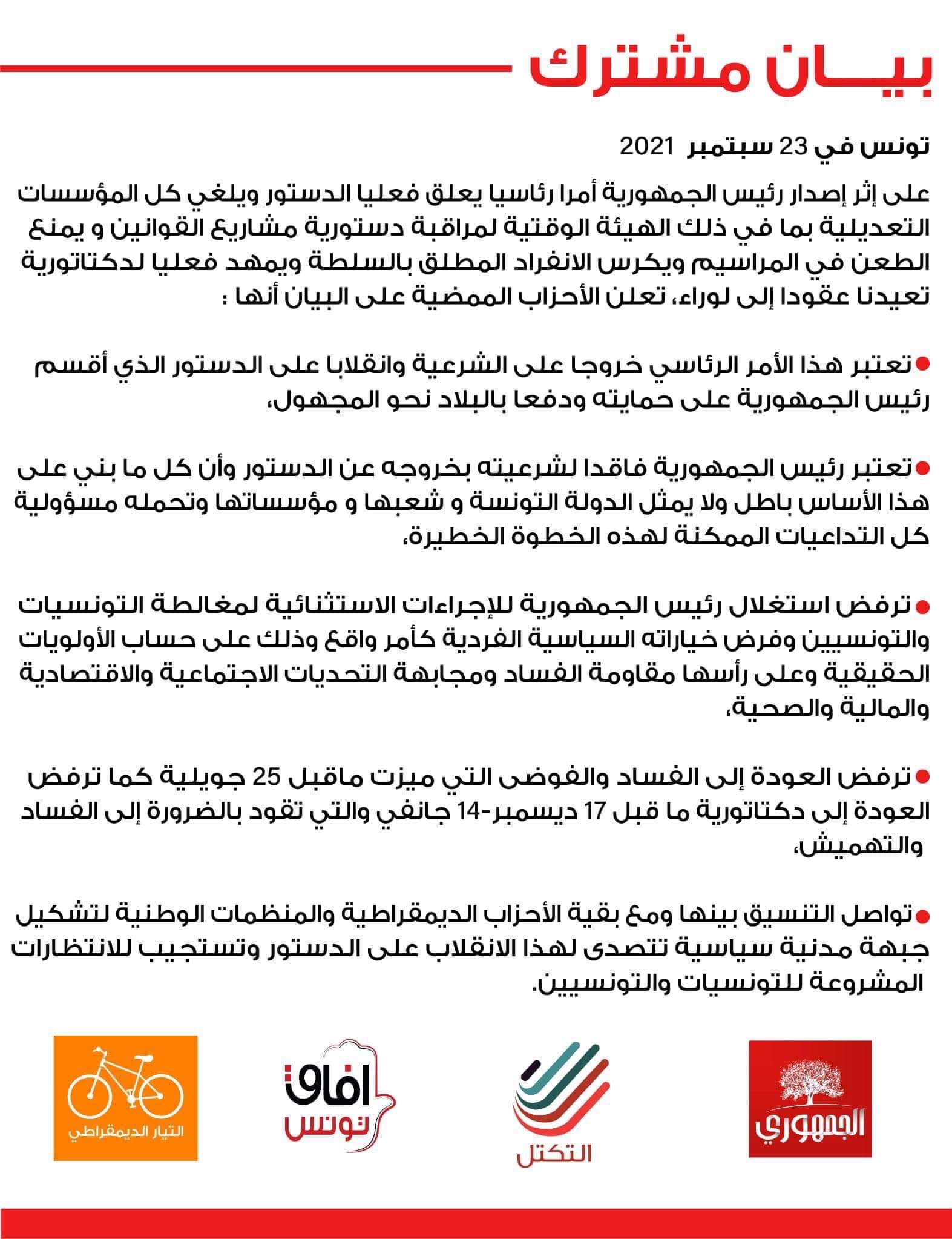 وقالت الأحزاب المذكورة إنها ستواصل التنسيق بينها ومع بقية الأحزاب الديمقراطية والمنظمات الوطنية لتشكيل جبهة مدنية سياسية تتصدى لهذا الانقلاب على الدستور وتستجيب للانتظارات المشروعة للتونسيات والتونسيين حسب نص البيان .