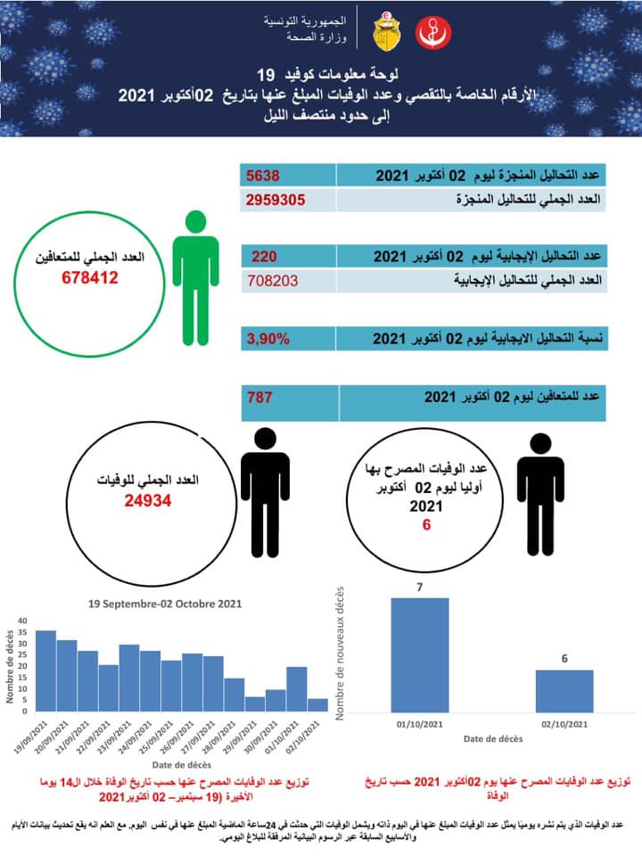 أعلنت وزارة الصحة بتاريخ 02 أكتوبر 2021، 220 إصابة جديدة بكوفيد 19 إثر إجراء 5638 تحليلا مخبريا، لتبلغ نسبة التحاليل الإيجابية لتقصي كورونا 3.90 بالمائة.