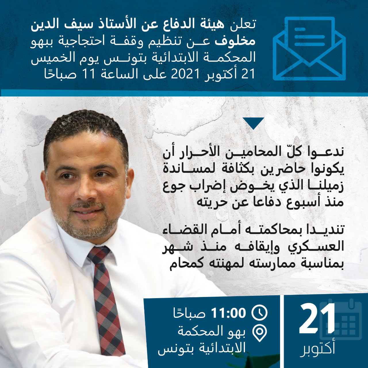 أعلنت هيئة الدفاع عن الأستاذ سيف الدين مخلوف ، عن تنظيم وقفة احتجاجية ببهو المحكمة الابتدائية بتونس ، يوم غد الخميس 21 أكتوبر 2021 ، على الساعة 11 صباحا