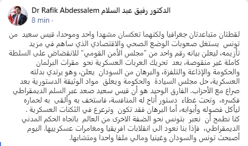 علّق القيادي في حركة النهضة، رفيق عبد السلام، على الانقلاب العسكري في السودان، معتبرا أن ما حدث في هذا البلد وفي تونس يعكس 'مشهدا واحد وموحدا'.