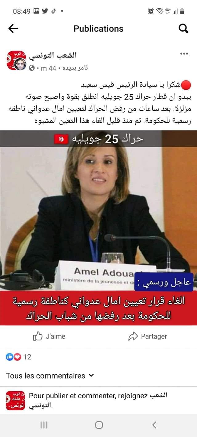 قرّرت رئيسة الحكومة نجلاء بودن، التراجع عن تعيين آمال العدواني، في خطة ناطقة رسمية باسم الحكومة.