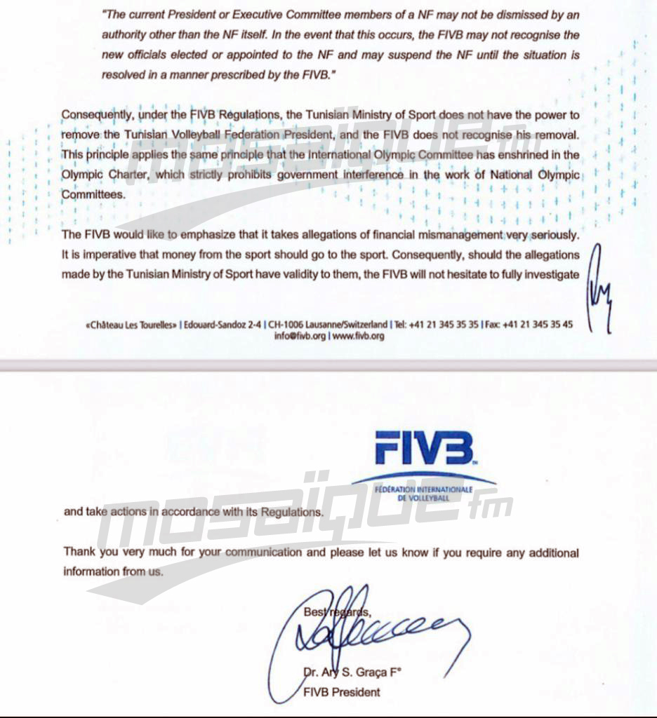 أكدت العديد من المصادر الاعلامية ، ورود مراسلة من الاتحاد الدولي للكرة الطائرة على وزارة الشباب و الرياضة، للاستفسار و طلب توضيحات بخصوص قرارها المتمثل في تجميد رئيس الجامعة التونسية للكرة الطائرة فراس الفالح.
