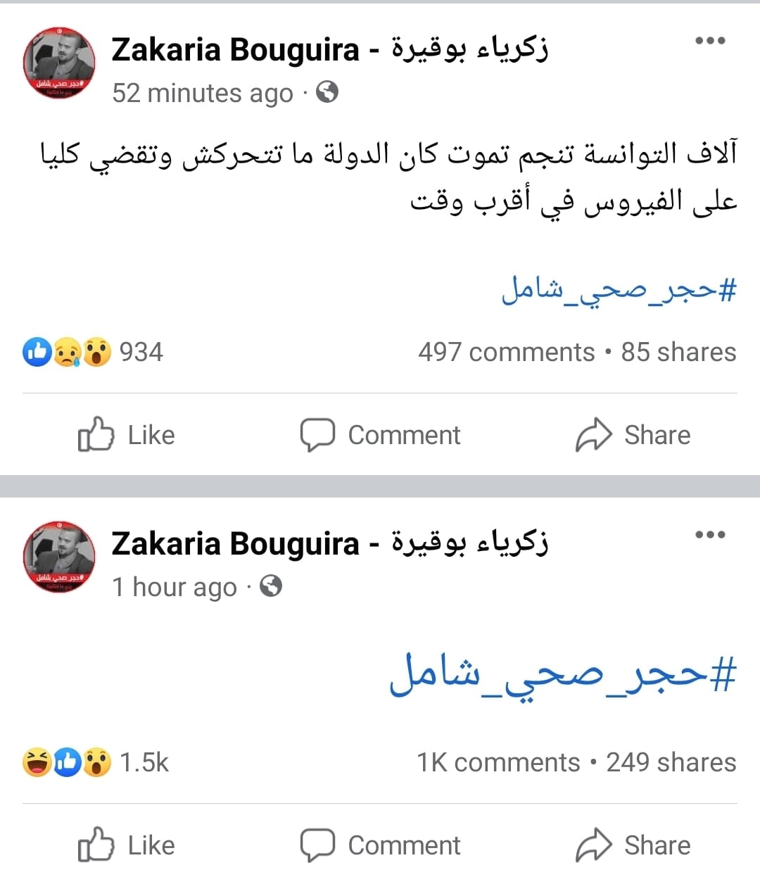 واوضح بوقيرة، في تدوينة على صفحته بموقع التواصل الاجتماعي الفايسبوك: ''آلاف التوانسة تنجم تموت كان الدولة ما تتحركش وتقضي كليا على الفيروس في أقرب وقت''.