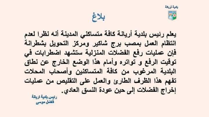 أعلنت بلدية أريانة ، اليوم الخميس 25 نوفمبر 2021 ،في بلاغ لها على الصفحة الرسمية بموقع التواصل الاجتماعي ،الفيسبوك أنه نظرا لعدم انتظام العمل بمصب برج شاكير ومركز التحويل بشطرانة فإن عمليات رفع الفضلات المنزلية ستشهد اضطرابات في توقيت الرفع وتواتره.