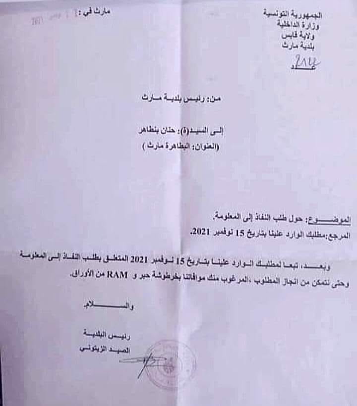 وجاء في الوثيقة ،أن مواطنة من منطقة البطاهرة طلبت من رئيس بلدية مارث النفاذ إلى معلومة، فكان الردّ أن توفّر 'خرطوشة حبر ومجموعة من الورق'.