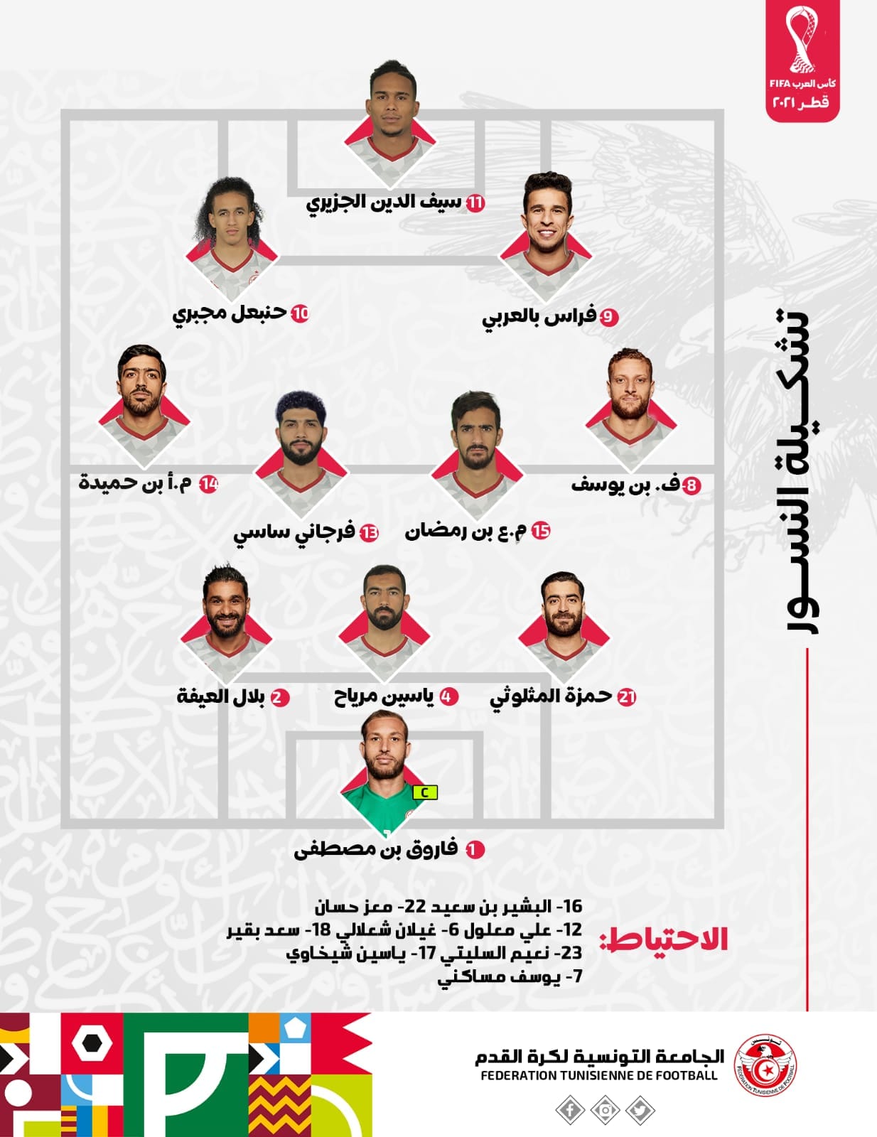 يواجه المنتخب الوطني التونسي، بداية من الساعة (11.00) لكرة القدم ، مباراته الاولى لحساب كأس العرب لما يواجه منتخب موريطانيا ، و من المنتظر ان يعتمد منذر الكبيّر على التشكيلة التالية :