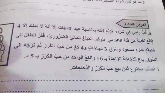 أكد مدير عام البرامج والتكوين المستمر بوزارة التربية، رياض بوبكر، إن التمرين الذي أثار جدلا على شبكات التواصل الاجتماعي، لأنه يُشجّع على السرقة هو في كتاب موازي وليس في كتاب رسمي تشرف عليه وزارة التربية.
