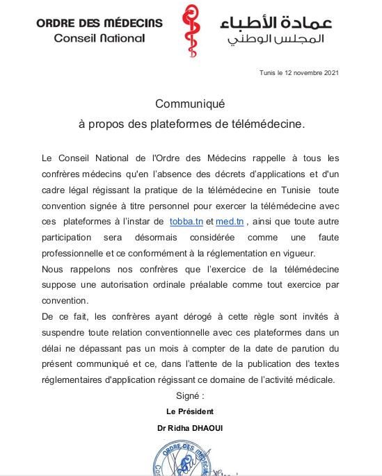كشف عميد الأطباء رضا الضاوي، اليوم الاثنين 6 ديسمبر 2021، أنّ العمادة تعمل على منع منصات التطبيب عن بعد بسبب عدم احترام القوانين التي تضبط المهنة.