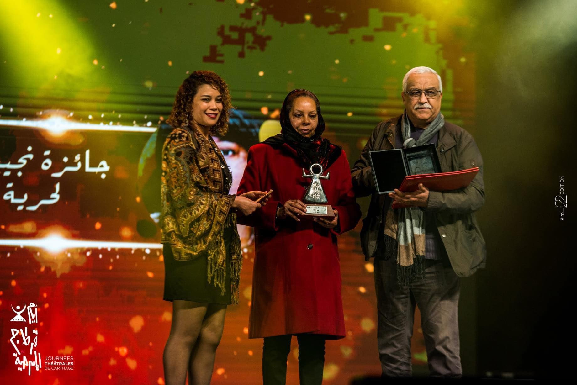وكانت لجنة تحكيم مسابقة جائزة النقابة الوطنية للصحفيين التونسيين "نجيبة الحمروني لحرية التعبير" في هذه الدورة الثانية والعشرين لأيام قرطاج المسرحية قد حرصت على مشاهدة كل العروض التونسية التي تتناول مسألة الحريات بصفة عامة وحرية التعبير على وجه الخصوص نظرا لارتباطها باسم فقيدة الساحة الإعلامية النقيبة الراحلة نجيبة الحمروني التي تميزت طوال مسيرتها بالدفاع عن قواعد وأخلاقيات المهنة من جهة، وعلى الحريات وخاصة حرية الصحافة وحرية التعبير من جهة أخرى وقد دفعت للأسف ثمن ذلك باهضا من قبل أعداء الحرية.