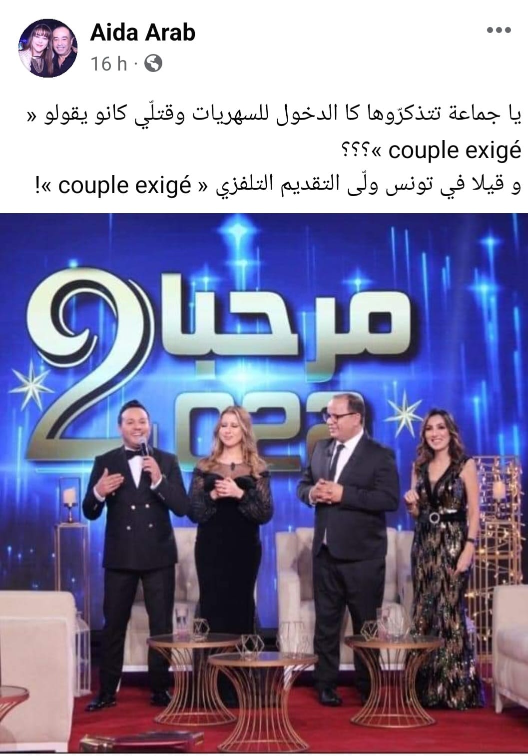 قالت الاعلامية عايدة عرب، أن النقديم التلفزي، أصبح بمثابة ال 'couple exigé ' في تعليق على تقديم كل علاء الشابي و نوفل الورتاني و زوجتيهما، يقدمان منوعة رأس السنة على التاسعة.