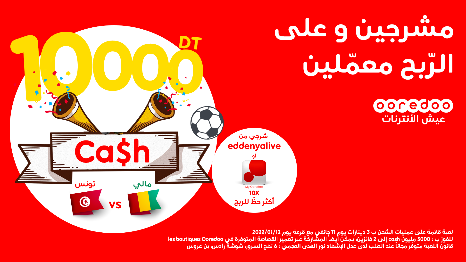 بمناسبة المغامرة الإفريقية التي يخوضها نسور قرطاج، تطلق Ooredoo لعبة خاصة بحرفائها للفوز بعدة جوائز نقدية حيث يمكن للراغبين في الفوز القيام بعملية بسيطة تتمثل في شحن هواتفهم بمبلغ 3 دنانير فما فوق قبل يوم من المباراة الأولى للمنتخب التونسي خلال دوري المجموعات (يوم الثلاثاء 11 جانفي 2022).
