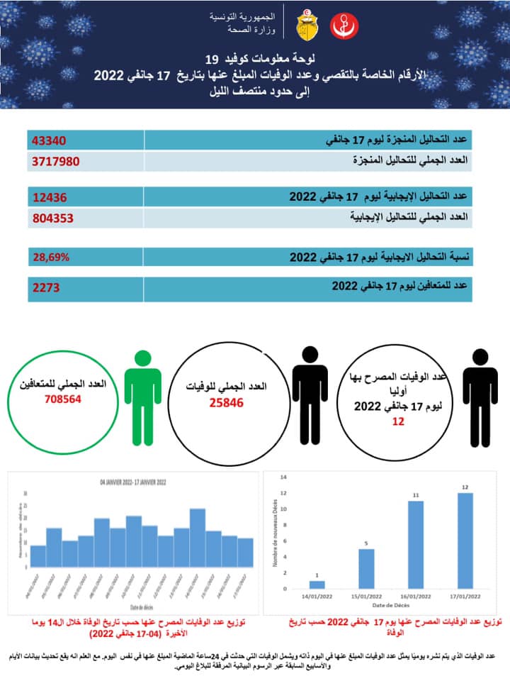 أعلنت وزارة الصحة، في بلاغ اليوم الأربعاء 19 جانفي 2022، عن تسجيل 12 حالة وفاة و12436 إصابة جديدة بفيروس كورونا وذلك بعد اجراء 43340 تحليلا مخبريا بتاريخ 17 جانفي 2020 وبلغت نسبة التحاليل الإيجابية 28.69 بالمائة.