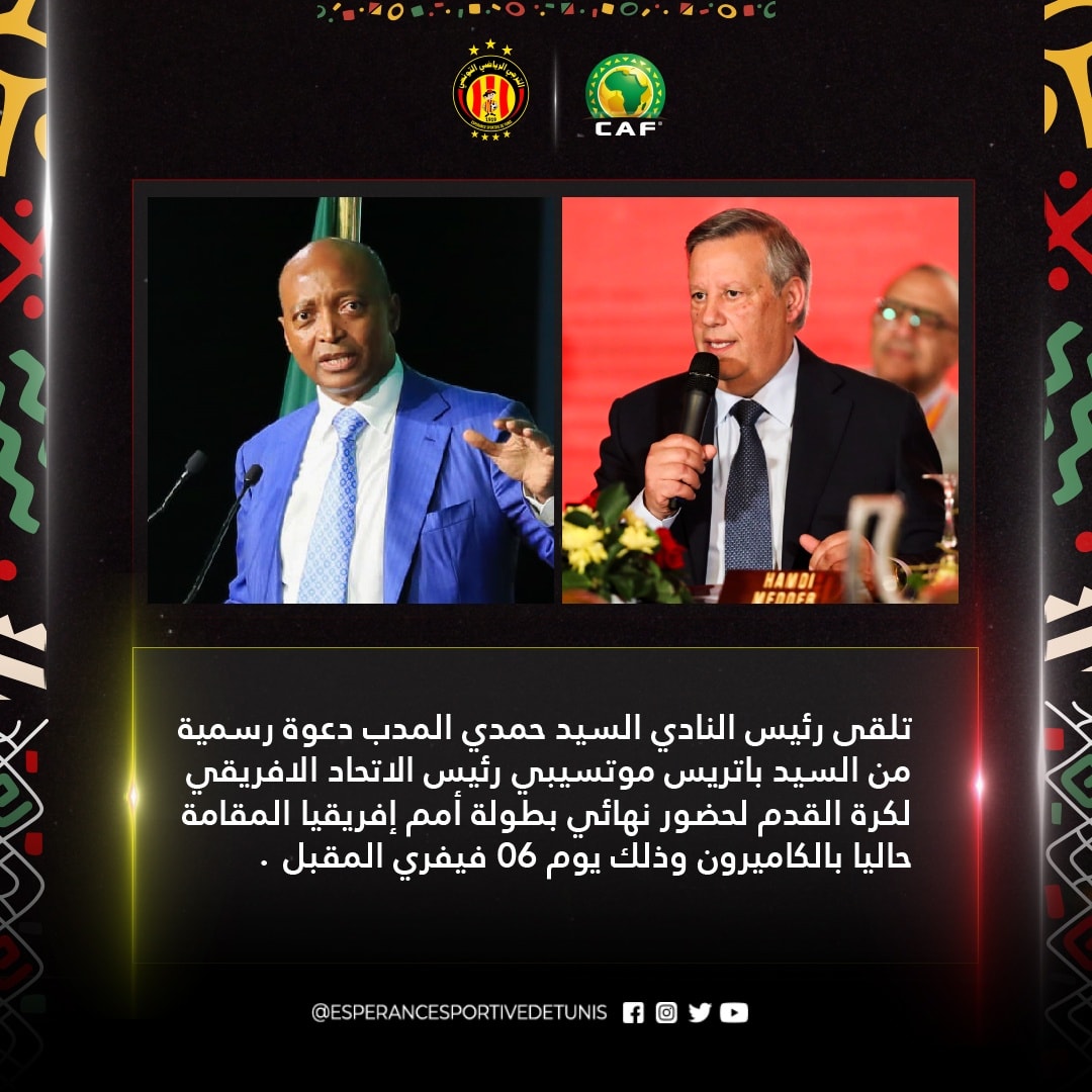 تلقى رئيس النادي حمدي المدب تلقى دعوة من رئيس الكنفدرالية الافريقية لكرة القدم باتريس موتسيبي، من أجل حضور نهائي النسخة الحالية من كأس افريقيا للأمم في السادس من الشهر القادم حسب ما أعلنت عنه الصفحة الرسمية على الفايسبوك الترجي الرياضي التونسي .