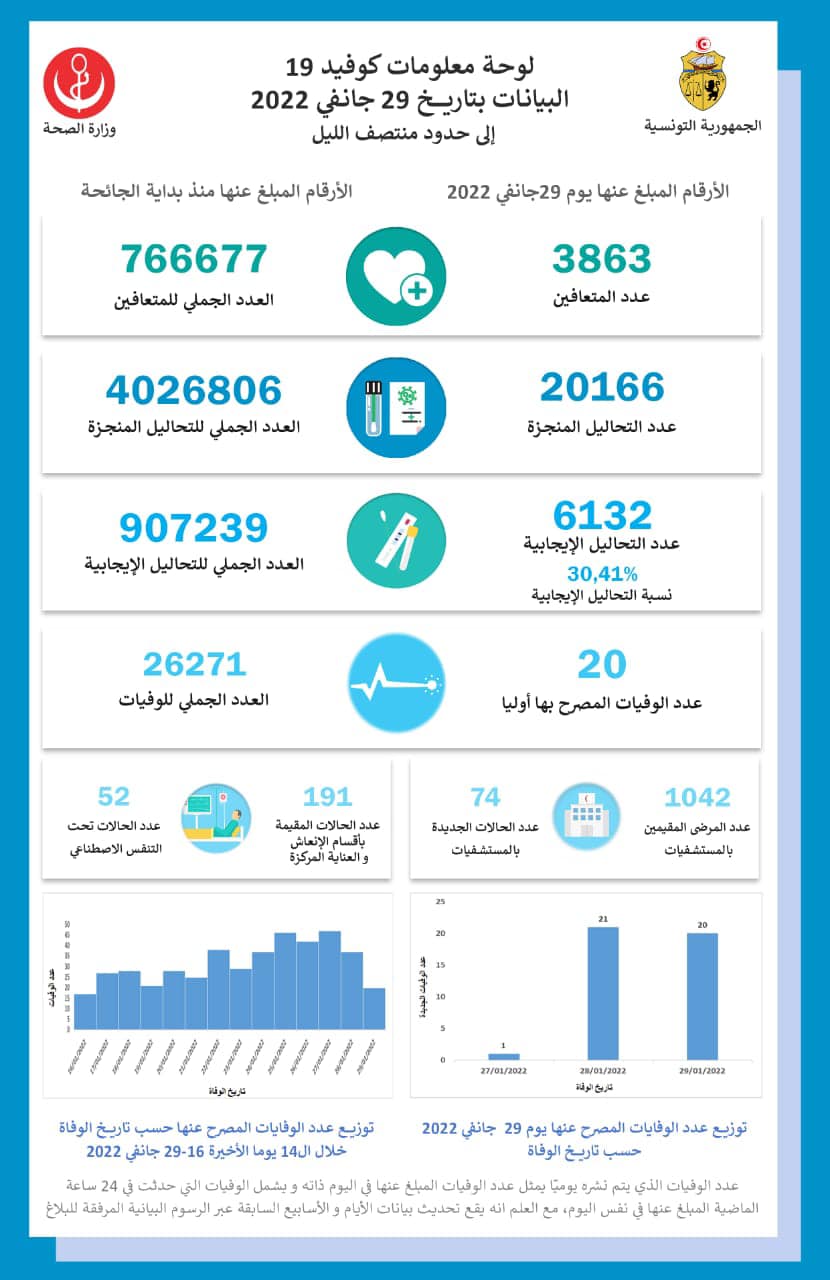 سجلت تونس بتاريخ 29 جانفي 2022، 20 حالة وفاة بفروس كورونا و6132 إصابة جديدة، ليرتفع بذلك إجمالي الوفيات منذ بداية الجائحة إلى 26.271 حالة و907.239 إصابة.