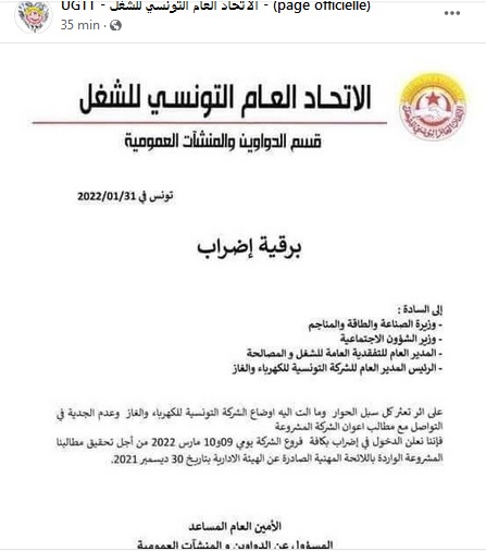 أعلن الاتحاد العام التونسي للشغل دخول أعوان الشركة التونسية للكهرباء والغاز، في إضراب بكافة فروعها يومي 9 و10 مارس المقبل.