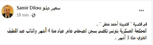 أصدرت المحكمة العسكرية في تونس حكما يقضي بالسجن للصحفي عامر عياد مدة 4 أشهر والنائب عيد اللطيف العلوي مدة 3 أشهر.
