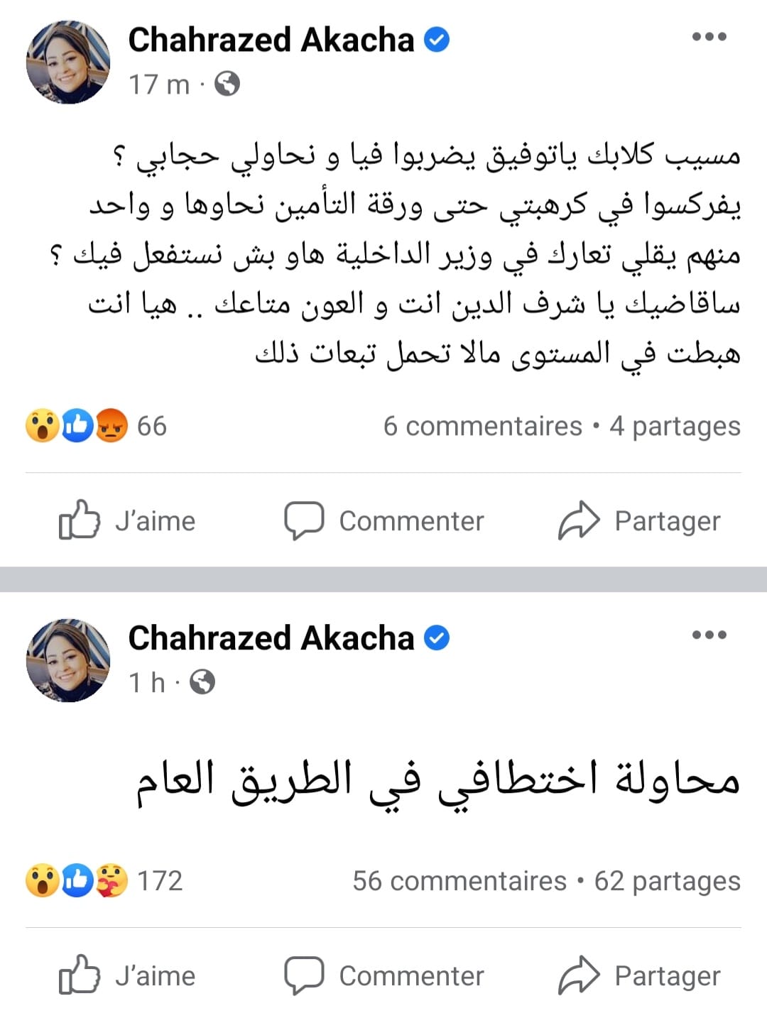 وأضافت شهرزاد في تدوينة على حسابها الرسمية بموقع التواصل الاجتماعي "فيسبوك" ، أنها تعرضت الى محاولة اختطاف ، مشيرة الى انها تعرضت الى العنف من طرف عون امن .