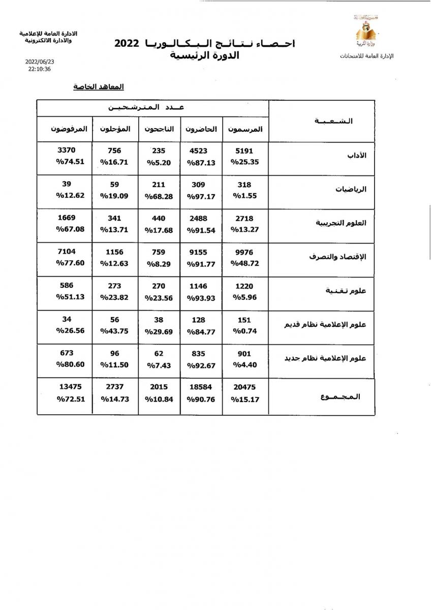 بلغت نسبة النجاح العامة في الدورة الرئيسية ،في امتحان الباكالوريا لسنة 2022، 37.97 بالمائة، حسب ما أعلنته وزراة التربية اليوم الجمعة 24 جوان 2022.
